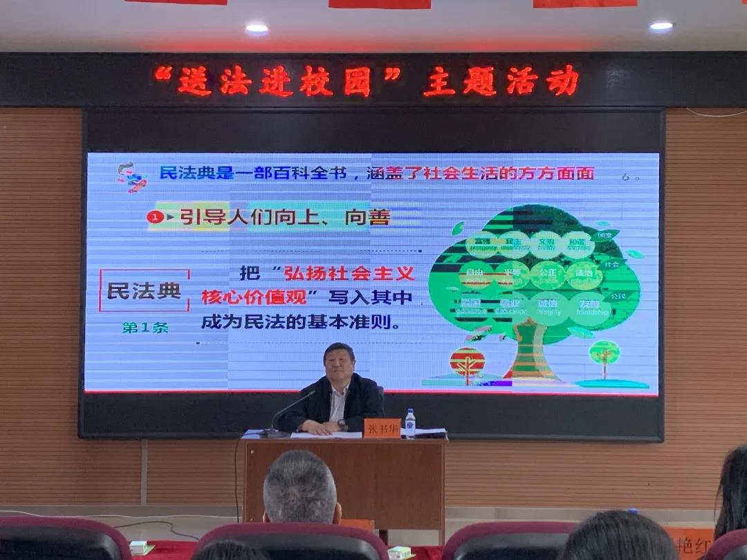 省检察院原副检察长张书华以《民法典》为主线,围绕校园欺凌、校园内外安全、未成年人保护等青少年关心的热点内容,摘取青少年法律故事为线索,灵活穿插现实生活案例,向与会师生生动讲解了《民法典》赋予同学们的权利义务,引导学生提高自我保护能力和自我维权意识,掌握自我保护的方法和技能。同学们也被各种案例吸引,频频与授课老师进行互动,课堂氛围十分活跃。活动中,向师生赠送了《民法典》书籍等普法宣传品100余份。