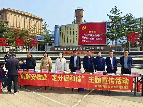 为充分发挥人民调解维护社会和谐稳定“第一道防线”作用,全面推进物业纠纷化解工作,4月17日,延边州司法局联合延吉市司法局、延边州物业协会等单位,在延吉市建工街道延春社区初心广场开展了“调解安物业 定分促和谐”主题宣传活动。