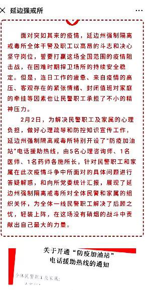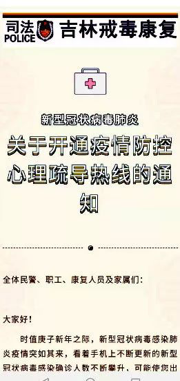 吉林省司法厅戒毒管理局按照司法部戒毒管理局的部署要求,在全省各戒毒场所组织开展新型冠状病毒感染肺炎疫情防控工作的同时,积极开展民警、职工和家属以及戒毒人员防疫的宣传教育和心理服务工作,重点开展心理危机干预工作。