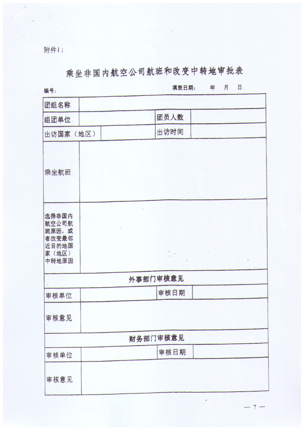附件1:《乘坐非国内航空公司航班和改变中转地审批表》